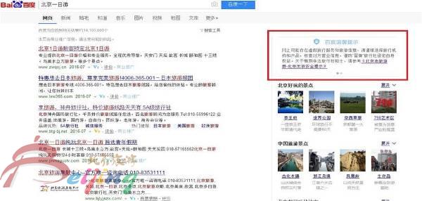 为了规范北京旅游市场环境秩序,引导游客选择正规旅游企业参加旅游,在前期通过市网信办与百度、360、搜狗三家搜索引擎公司建立相应工作机制,大力整治网络虚假旅游信息的基础上,针对外地来京游客在网上,尤其是通过百度搜索引擎搜索报名网站的需求量较大这一特点,为更好预防游客上当受骗,市旅游委在百度搜索引擎上推出了“北京出游安全提示”。
