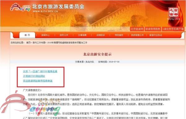 在提示下方会有市旅游委提供的《北京市旅游委-北京出游安全提示》网址链接,游客点击此链接就能直接打开市旅游委官方网站上的《北京出游安全提示》,其内容包括北京“一日游”旅行社推荐名单、正规旅行社网站网址、非法旅游网站宣传招徕电话等内容。在方便游客选择正规旅行社的同时,还能对网络虚假旅游信息进行有效甄别,从而避免上当受骗,更好的保护自身合法权益不受损害。