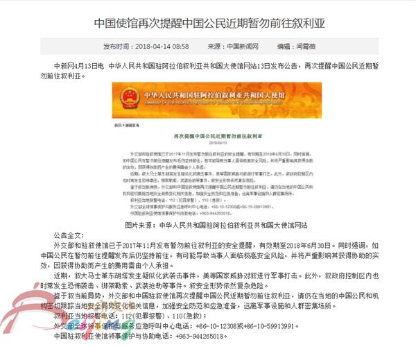 国家文化和旅游部提示中国使馆再次提醒中国公民近期暂勿前往叙利亚。