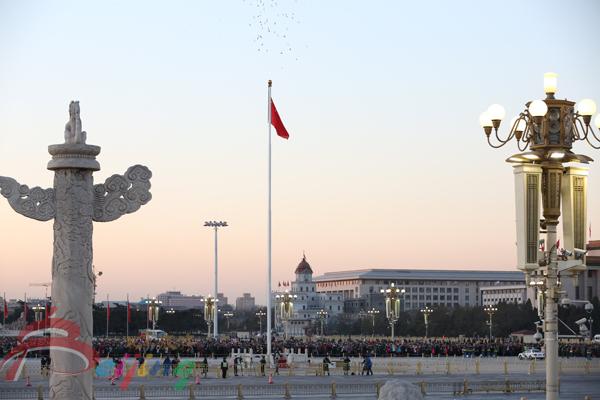 北京天安门广场升国旗仪式在重大节日更加隆重庄严。7时35分,伴随着激昂的《中华人民共和国国歌》和东方初升的朝阳,五星红旗在天安门广场冉冉升起。一万只象征和平、吉祥的和平鸽放飞蓝天,将活动气氛推向高潮,也将祖国心脏的欢乐信息传递到四面八方。到北京天安门广场观看升国旗仪式是来自全国和世界各地游客们喜爱的旅游项目,是首都独一无二的旅游资源,深受广大游客和全国各族人民的喜爱。来北京天安门广场观看升旗仪式,表达对祖国的深沉挚爱和美好祝福,已经成为每天清晨天安门广场上的一道亮丽风景线。